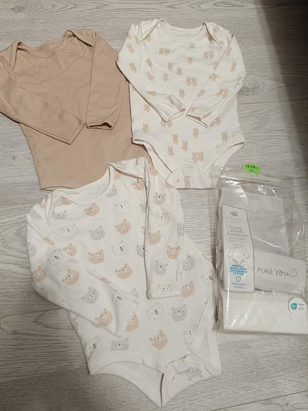 5 бодиків, Primark на 86-92 см. З цього набору ми три носили мало, два зовсім не одягали. 2 фото ношені, без дефектів,без плям,як нові. 3 фото нові. Довжина рукава від плеча 29.5 см, пог 25.5 см, довжина 43 см. Кольори: два білих з різними ведмедиками, бежевий,білий, сірий з написом. Ношені 80 грн штука, новий 120 грн штука.