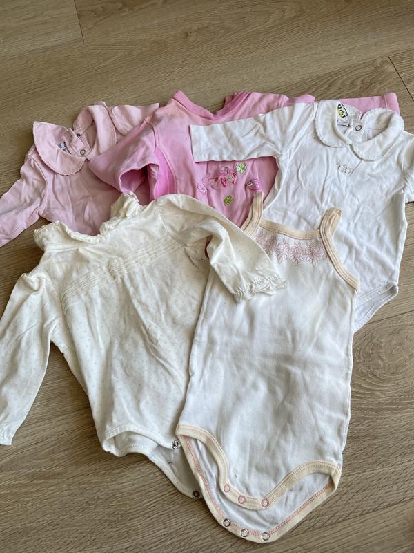 Возраст 3-6 мес Майка на 12 мес, имеет пятно Белый и розовый с воротничками - состояние отличное, 3-6 мес С воротничком в точку - имеет пятнышки, 6 мес. Человечек 3 мес. Имеет катышки Цена за все Код: РНХ