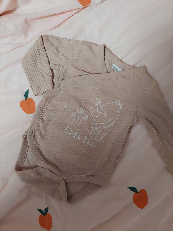 хорошего качества боди в рубчик на запах на кнопках, в красивом состоянии без дефектов, идет по факту на 6-10мес. красиво тянется.