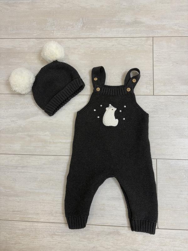 Дитячий комбінезон вʼязаний с шапкою с бубонами. Ширина шапки 15см, Добжина боді 48 від плеча.