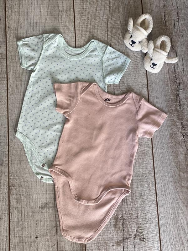 Боди с коротким рукавом H&M, размер 56-62, в идеальном состоянии. Пудровый H&M замеры: длина от плеча- 35 см, полуобхват-21 см. Мятный (Украина производитель) замеры: длина от плеча-38 см, полуобхват-20,5 см Цена за 1 шт. 60 грн. Пинетки-50 грн.