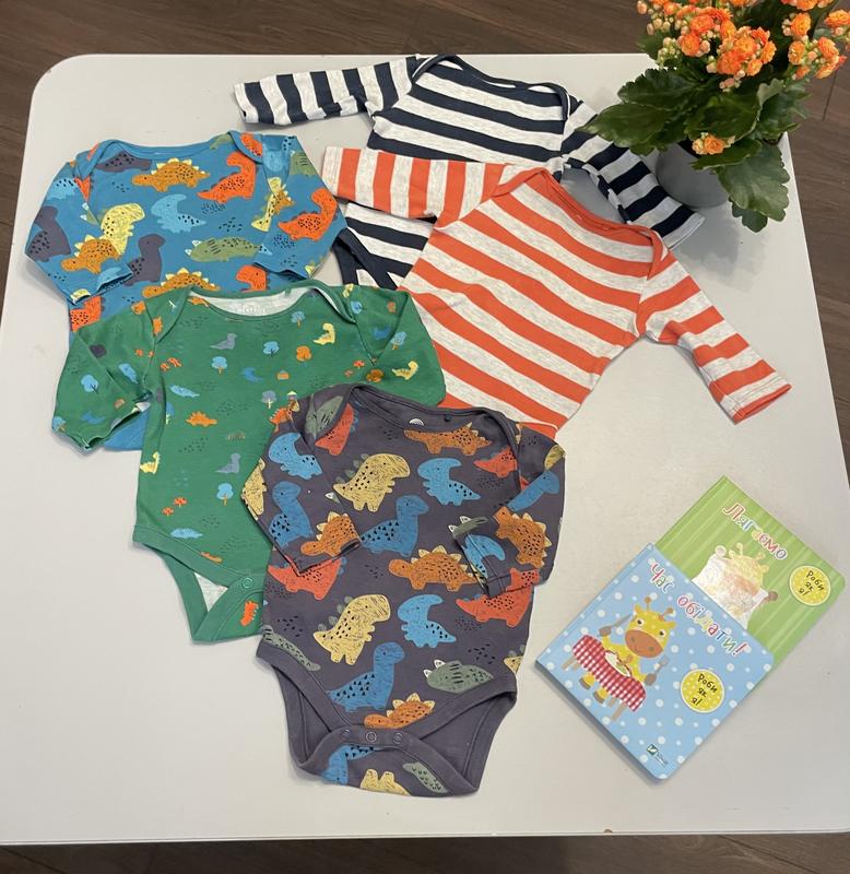 5 штук ярких детских бодиков от next. Подходит на размер 68 см, 8 кг, 3-6 месяцев. В отличном качестве, без потери цвета. Эффект: на некоторых есть незначительные следы стирки.