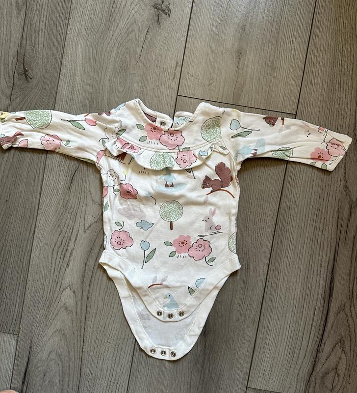 Боди на девочку с прикольным принтом, и цветочки и зверята. Интересное цветовое сочетание Размер указан 3-6, но будет дольше по сравнению с боди бренда carters, размер сочитается с их 6м. Поэтому указала два размера, по наборке 3-6 и по факту, 6-9. Заміри надам Стан наче нового