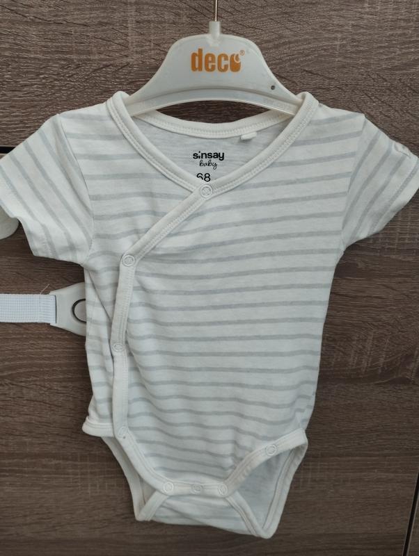 Боди детский, размер 68 (3-6 месяцев, мы носили дольше), на запах, все кнопки на месте. У нижней кнопки есть маленькое пятно, на фото видно