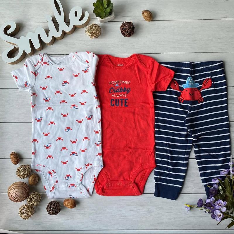 Чудовий бавовняний набір з двох боді та штанців, на попі характерний малюнок крабіка. Розмір 12м ( 72-76см)