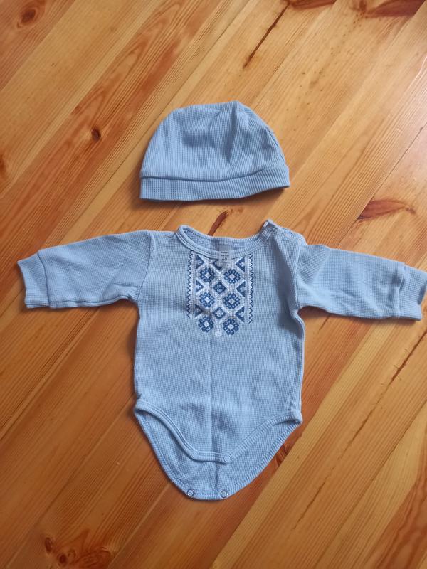 Праздничное боди с вышивкой + шапочка. ткань вафелька. Размер 68