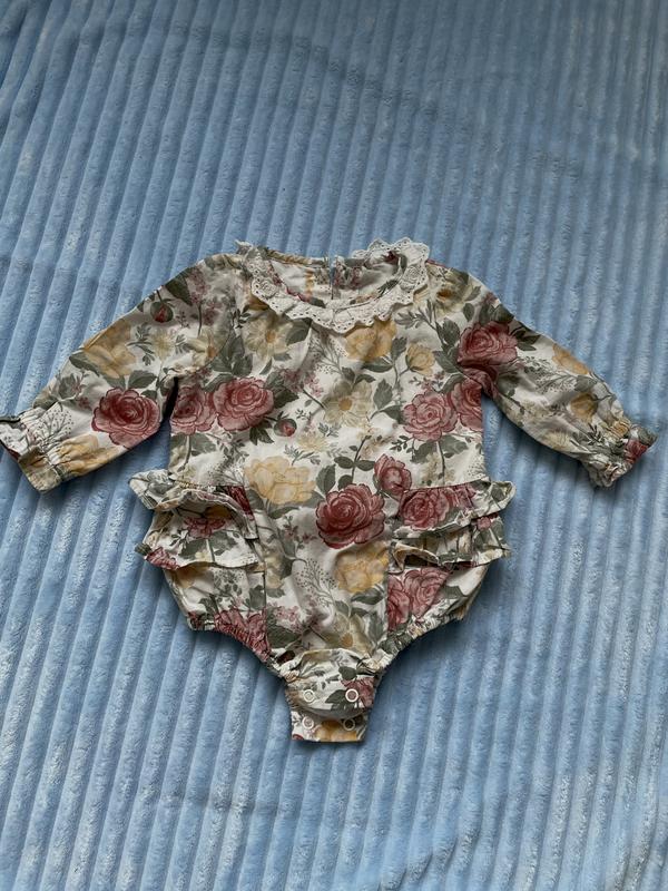 Святковий бодік на дівчинку. Тканина котон 100. Стан ідеальний, без жодних дефектів. Заміри: довжина - 35 см рукав - 23 см плечі - 18 см Квітковий принт, колір молочний.