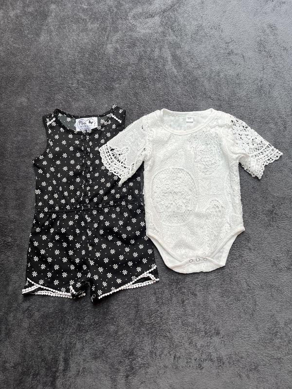 Красивий комплект для дівчинки на 18-24 міс: мереживне боді і Ромпер. Стан чудовий, єдиний нюанс на останньому фото- немає одної кнопки ( взагалі незамітно і ніяк не впливає на вигляд, але в ціну враховано ). Ціна за все разом