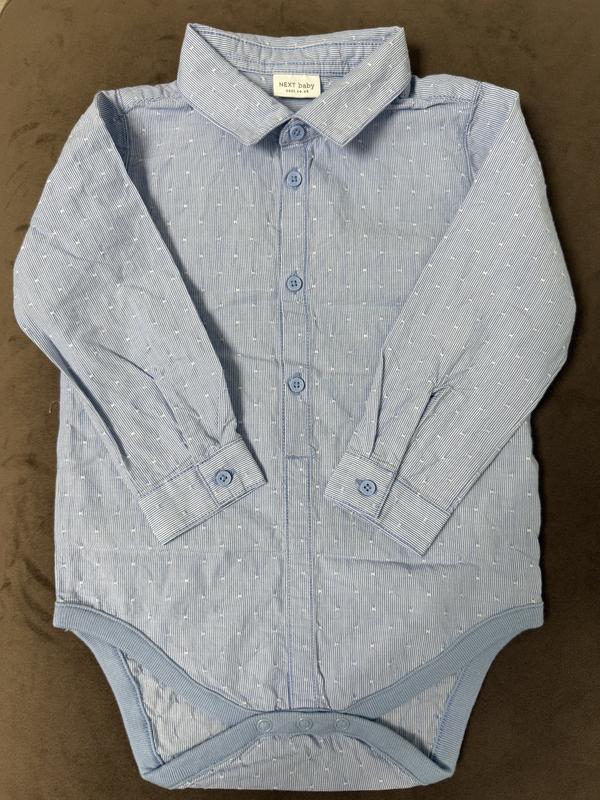 Сорочка-боді Гарного блакитного кольору в горошок Дуже зручна Ошатна Стан ідеальний, після однієї дитини, замовляла на офіційному сайті Розмір 12-18м