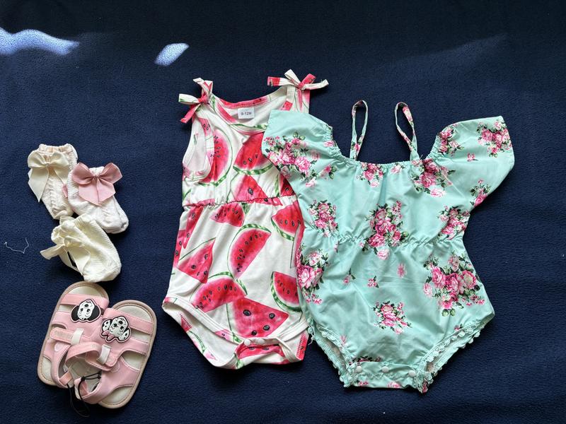 Боді для дівчинки в ідеальному стані, використовувалися для фотосесії 9-12міс (74розмір) також босоніжки 21розмір на мʼякій підошві( абсолютно нові) і носочки з бантиками (3пари)