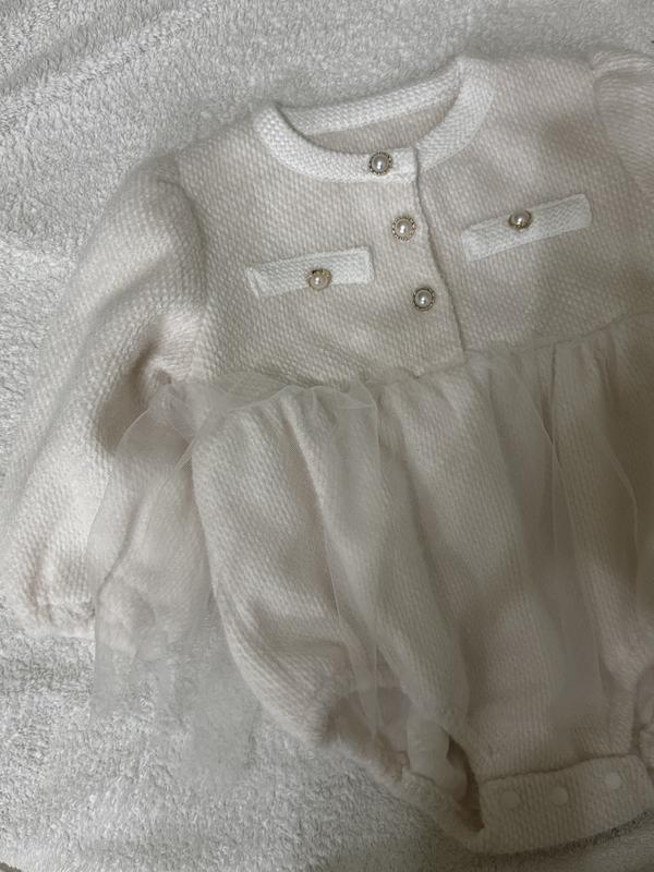 Нарядний бодік для дівчинки розмір 73 Розкішний бодік у ніжному пудровому кольорі, з довгим рукавом. Верх — з м’якої в’язаної тканини, оздоблений гудзиками-перлинками та декоративними “кишеньками”. Спідничка з легкої сітки додає образу ніжності — виглядає як маленька сукня. Застібається знизу на кнопки для зручності переодягання.