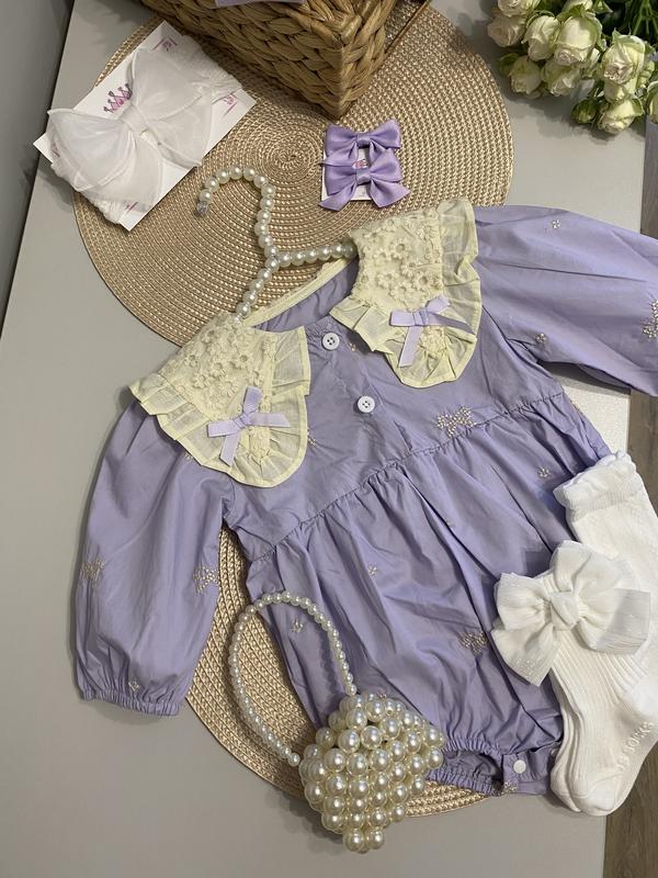 Боді з мереживним комірцем в дуже ніжному ліловому кольорі для малюків Розмір : 66- 73 80- Колір:ліловий Ціна -500 грн Гольфи - 70 грн Пов‘язочки -35 грн /шт