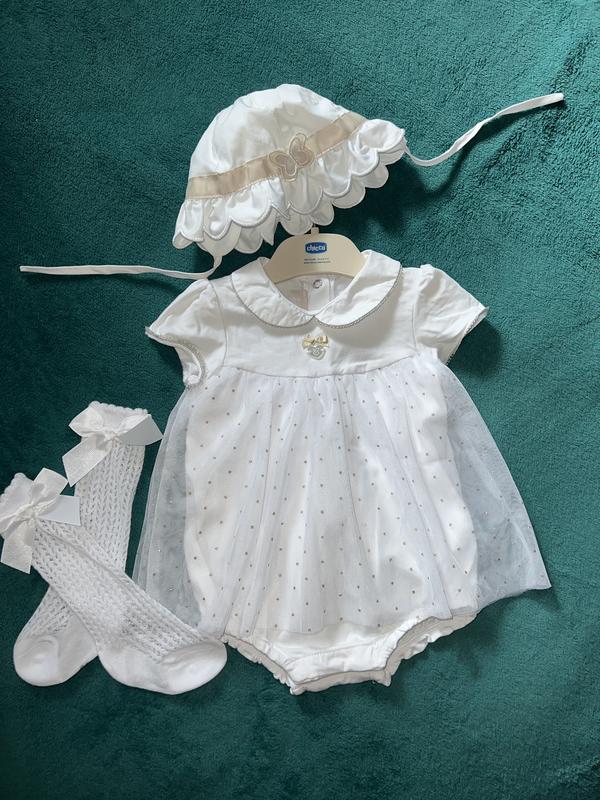 Панамка Chicco "Sofia" для дівчинки. Особливості: * матеріал – бавовна; * облямівка декорована вишивкою; * еластична вставка ззаду; Сукня-боді Chicco "Molly". Особливості: * матеріал з екологічно чистої бавовни; * декоровано ніжним фатином у вигляді спіднички та бантиком із фірмовим медальйоном; * кругла горловина з коміром; * на ніжках еластичні манжети; * на спинці застібки – кнопки; * внизу кнопки для легкого перевдягання та зміни підгузка. * сертифіковано OEKO-TEX®