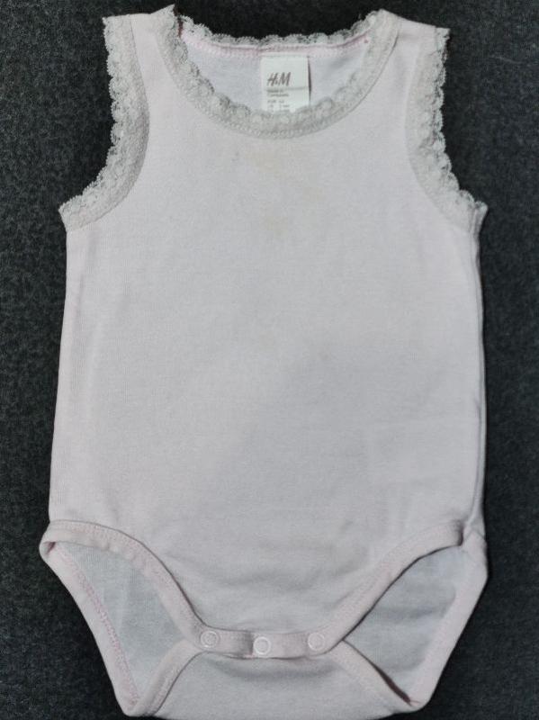 Минимальный заказ у продавца от 100 грн. Бледно-розового цвета бодик в очень хорошем состоянии на новорожденного малыша до трех месяцев, без рукавов. Отделка-кружево. Застёгивается на кнопки. Длина всего изделия от плеча 36 см, полуобхват груди 20 см. Ткань хлопок, тянется. Страна производитель: Комбоджия, фирма "H&M". Модель 251