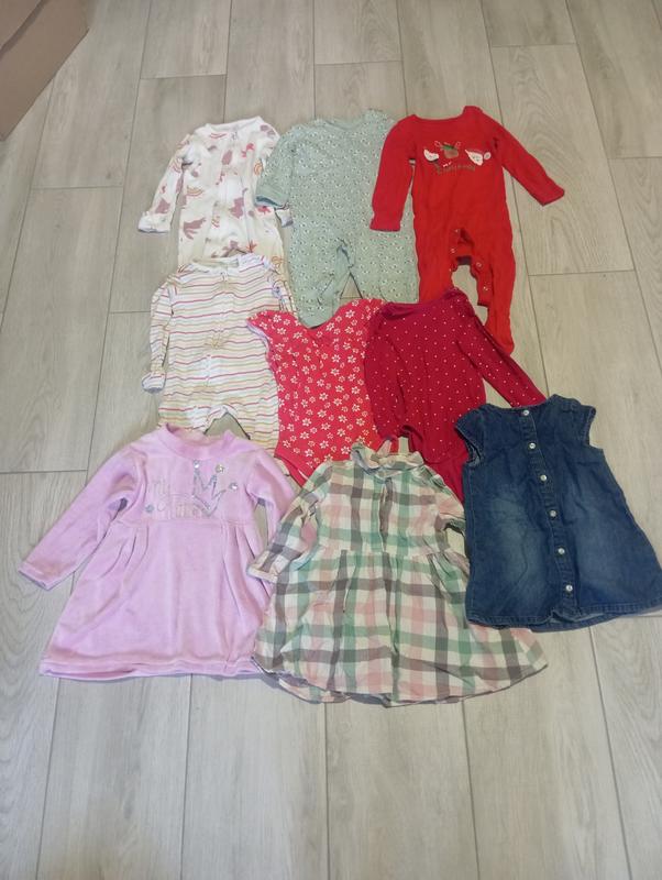Большой лот качественной детской одежды (9 предметов) на возраст 6-9 месяцев. Включает 3 слипа (один рождественский), 1 песочник,2 боди и 3 платья/туники (розовая велюровая, в клетку, джинсовая). Разнообразный набор для девочки.