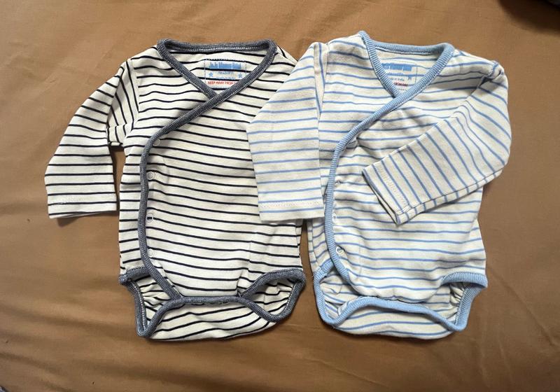 Боді для новонароджених, етикетку з розміром відрізала, буде на 50-56. Чудова якість. Блакитний одягали 1 раз, темний не встигли одягнути жодного разу. 1 боді - 50 грн, 2 - 80 грн