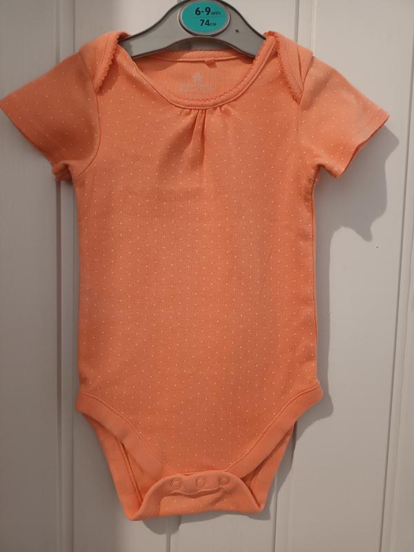 Артикул А04 Бодик в отличном состоянии из домашнего шкафа, дефектов нет. Цвет коралловый в мелкий горох. Бирка основная срезана. Состав хлопок. Ткань тянется в меру. 📌 Замеры - плечо 3 - длина рукава 8 - длина по боковому шву 19 - длина по спинке 40 - полуобьем по груди 21 На возраст 0-3 месяца. 📦 Отправка новой почтой и укрпочтой при оплате на карту. Наложенного платежа нет.