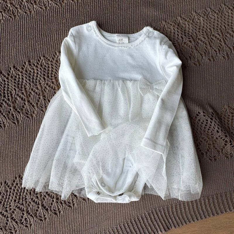 Нарядний боді зі спідницею у блискіткахв стані нового, ми не одягали.Колір айворі!Можна на хрещення чи новий рік чи інші свята. Вживу дуже красивий. Рукав 28,5 від плеча Під руками 23 До памперса 44,5