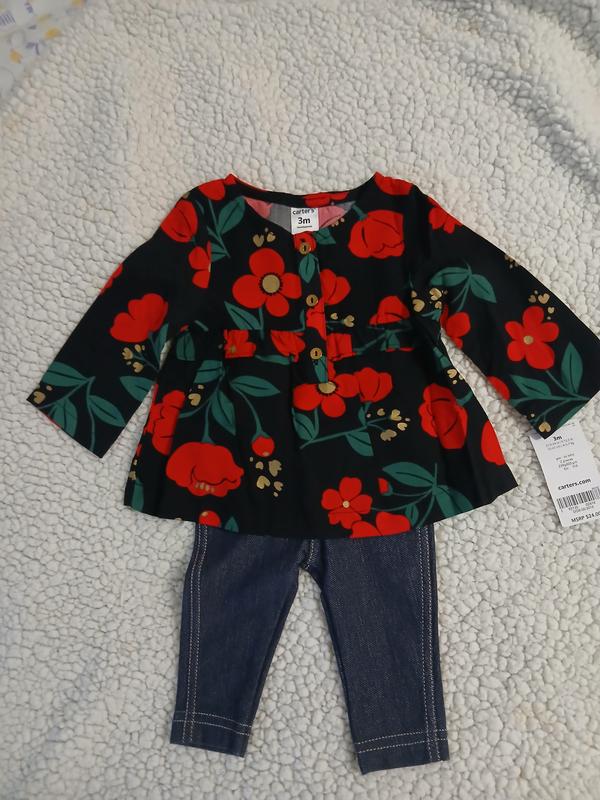 Очаровательный комплект для девочки от известного бренда Carter's. Включает стильную кофточку с длинными рукавами и ярким цветочным принтом (красные цветы, зеленые листья, золотистые акценты на черном фоне) и удобные синие джеггинсы. Кофточка имеет пуговицы спереди. Размер-3 месяца