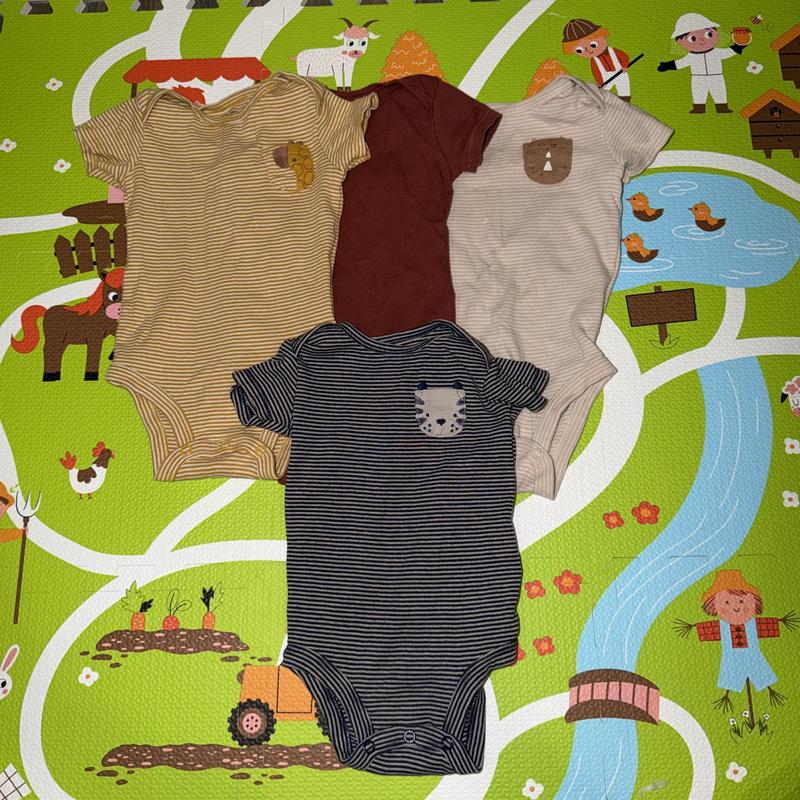 Всі боді по 100 грн/шт Комплект з левом 300 грн Комбінезон 150 грн(іншого бренду) Комплект зі сніговиком 200 грн(є дефект на штанях, сіра пляма) Штанці 150 грн Чоловічок з левами 200 грн Весь одяг на 6 місяців