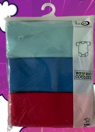 Набір дитячих боді з органічної бавовни складається з 3 штук різних кольорів (блакитний, синій та червоний). Боді мають розмір 68, що відповідає віку дитини приблизно 4-6 місяців, довжині 63-68 см та вазі 7-8 кг.
