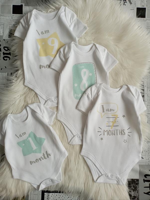 набор боди с цифрами (в возрасте по месяцам) но есть только 4 шт. размер из бирок один на 1 м и три на 6-9 м. (хотя чуточку разные) те, что на 6-9 м. новые, точнее один раз стирались но не одевались. на 1 м. в идеальном состоянии. заміри є на фото. продаю набором.