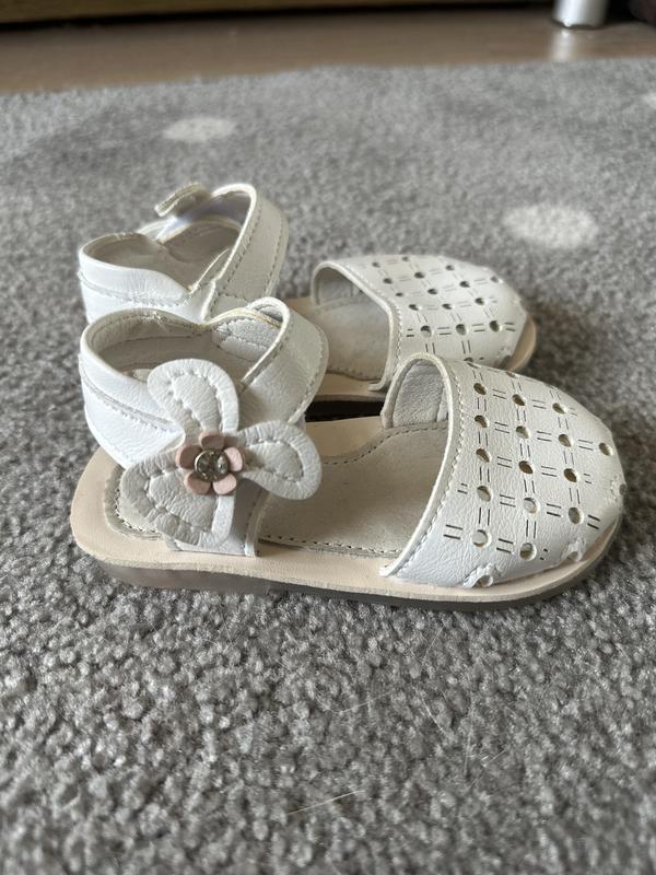 Босоніжки для дівчинки 21 розмір По замірам мають від пальчика до кінця пʼятки 15.5 см (це в притик буде). А так до 14.5 см для комфортного носіння. Одягали декілька разів на свято