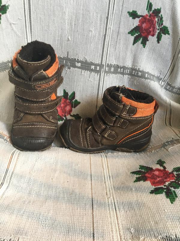 Отличные ботиночки коричневого цвета, комбинация натуральной и синтетической кожи, моранчевые вставки, застегиваются на три липучки, простроченные фирменными строчками, надежная подошва,фирмовые лейбы, утепленные внутри, весеннево-осенни.