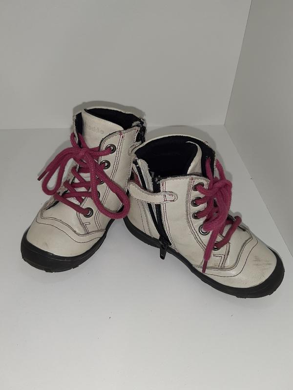 Кожаные ботинки молочного цвета для девочки на ногу до 14.3 см, полнота регулируется шнурком, фиксатор замочка от расстегивания. Состояние и замер на фото.