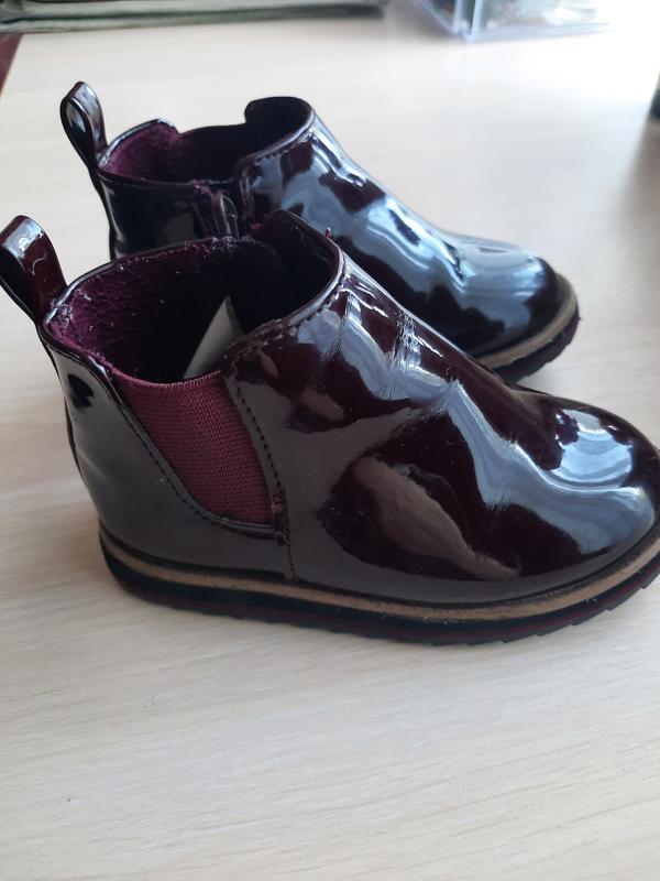 Очень красивые ботиночки для вашей девочки, на них все обращают внимание....Стильные и удобные.Лаковые.Есть незначительные царапины, которые мало заметны при носке.13.5 стелька.