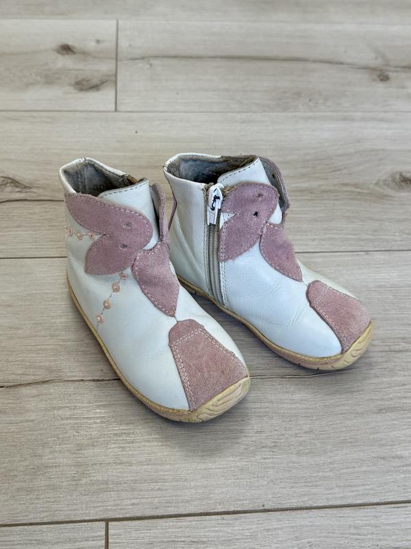 Продам очень классные демисезонные кожаные сапоги для девочки Кенгуру 21 размера, стелька 13 см, выполнены в белом цвете с нежными замшевыми розовыми вставками на носке и в виде декоративных крылышек бабочки, украшенных бисером. Легкие, кожа внутри и снаружи, что обеспечивает комфорт для детской ножки. Удобная боковая застежка-молния позволяет легко и быстро обуваться. Гибкая подошва идеально подходит для первых шагов. Сапоги в отличном состоянии, без дефектов.