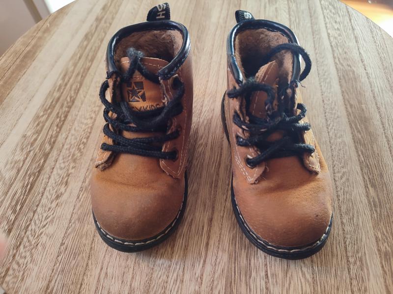 Отличные кожаные утепленные ботиночки 21 размера. Внутри мех, прошиты. Присутствующие следы ношения, есть пятнышки на носках и чуточку потрепан шнурок. В целом, состояние хорошее. Легко обуваются, так как имеют сбоку замочек и шнуровку спереди.