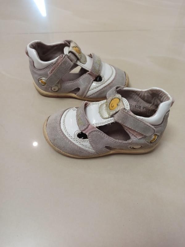 туфли кожаные, стелька 13.5 см, подойдет на высокий подъем, кожа снаружи и внутри. Размер указан 22, подошва не стерта, липучка хорошо держит.