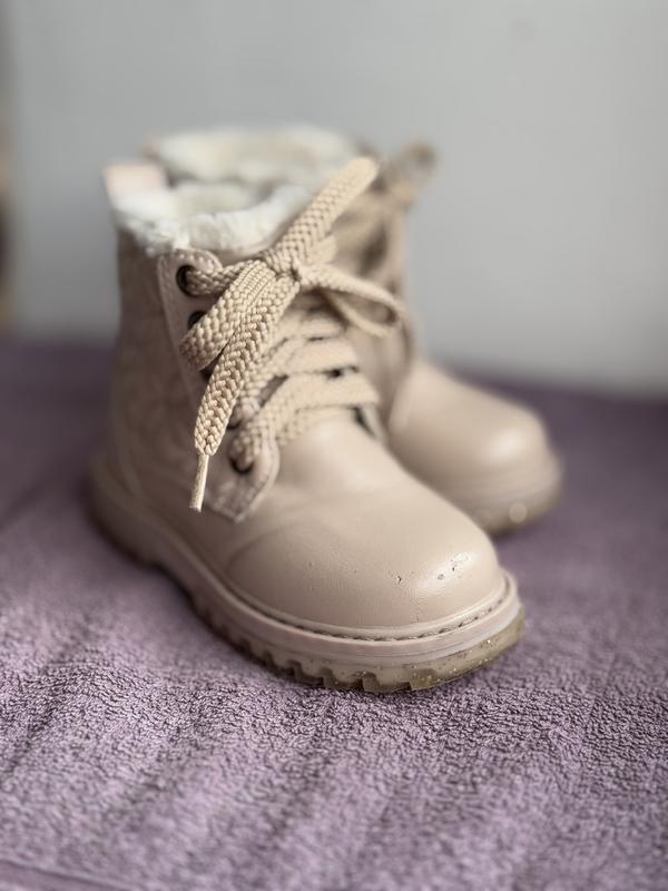 Дитячі черевики Next 🔹 Розмір: UK 5 (EU 21.5-22, довжина устілки близько 13 см, важко зробити точний замір) 🔹 Стан: ідеальний, є трішки потертості зверху, оскільки дитинка ще бувало падала, при носці не є сильно помітно; носили мало (купляли новими, після 1 дитини). По температурі до перших снігів. 🔹 Мають шнурівку та замочок, зручно одівати. 🔹 Мають зверху по контору хутро, але це лише імітація, на фото видно яка підкладка всередині
