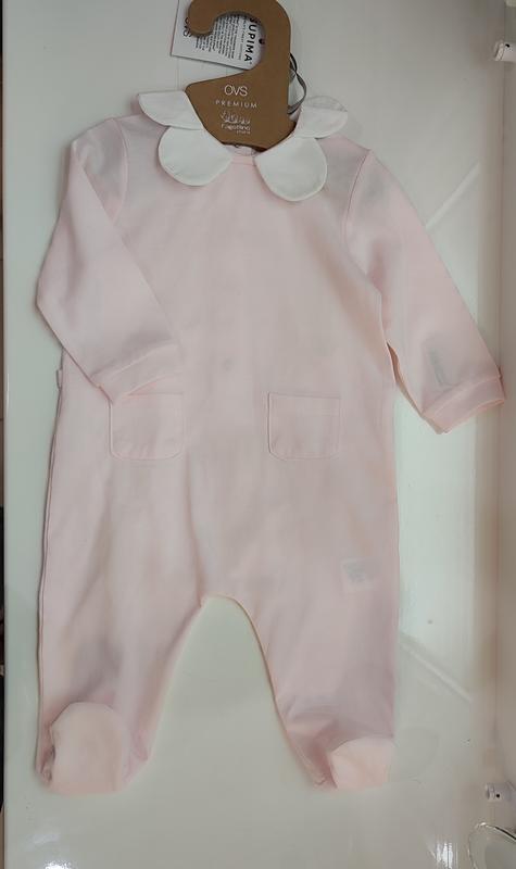 Человечек из лекого натурального трикотажа, нежного розового цвета, ворота декоративный, как ромашечка. Позаду кнопки Размер 56 ( 1-3 месяца)