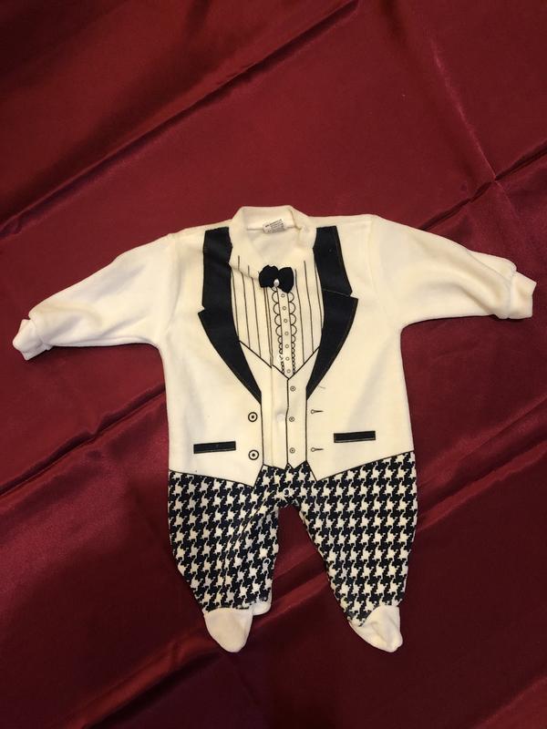Чоловічок на маленького джентльмена Розмір: на зріст 56 см ( 0-1 міс) Заміри: довжина 45 см; півобхват по груді 28 см; довжина рукава 21 см; плече 6 см; Тканина: 80% бавовна; 20% поліестер Колір: білий/чорний