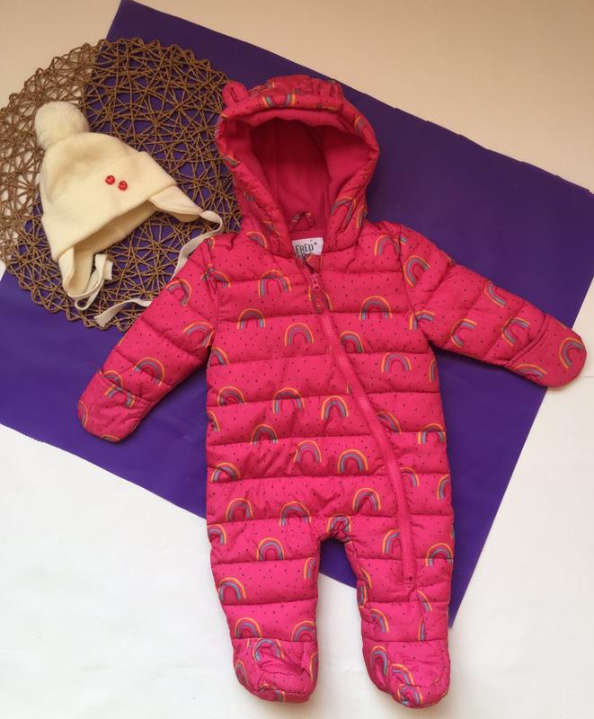 Демісезонний комбінезон, стан ідеальний, шапочка - подвійна в'язка. Утеплений тонким синтепоном і флісом до половини. Довжина 56 см Рукава - 26 см На бірці пише 0-3 міс. Ми носили до 5-ти.
