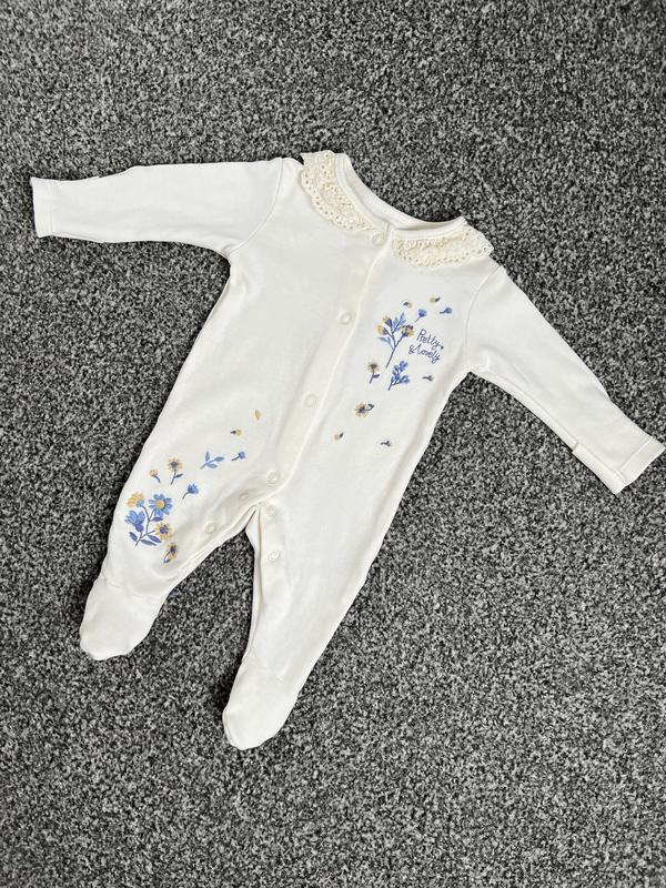 ✔️Відмінний стан ✔️Приємна тканина (100% бавовна) ✔️Гарний комірець ✔️Трендова вишивка ✔️Повністю розстібається Розмір 0-1 місяць (4,1 кг) Заміри: Довжина до пʼяточки - 43 см (+ 6,5 см стопа) Довжина рукава - 21,5 см Довжина тулуба - 29 см (від горловини) ПОГ- 23 см Плечі- 21 см