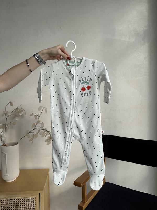 Белого цвета человечек с принтом, на молнии. Размеры в наличии: 0-3 мес, 3-6 мес, 6-9 мес, 9-12 мес.
