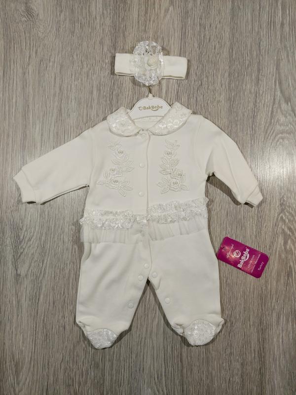 Красивый человечек с кружевом и повязкой. Цвет молочный. Размер 68, 74 см. Состав 100% хлопок. Полотно интерлок. Маломерит на один размер. Замеры: рост 68 см: ширина плеч 23 см, длина рукава от плеча 20 см, Пог 24 см, бедра 28 см, длина изделия 45 см; рост 74 см ширина плеч 23 см, длина рукава от плеча 22 см, Пог 24 см, бедра 28 см длина изделия 47 см. Производитель Турция. Цена 285 грн.