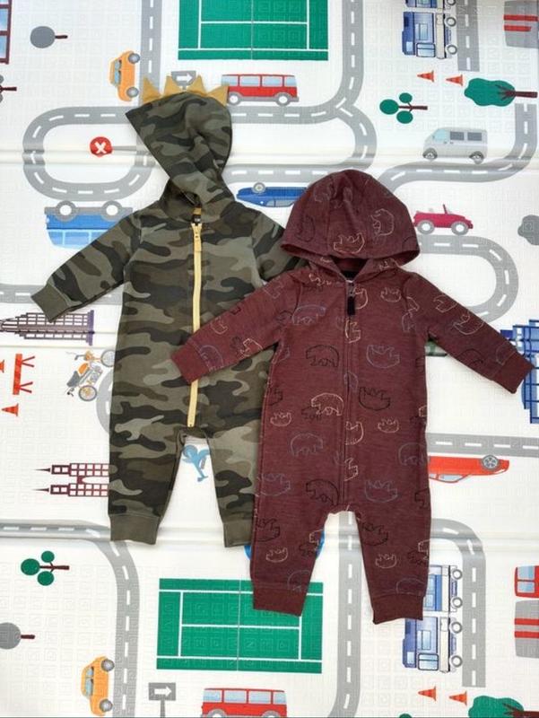 Продам трикотажные ромперы без утепления, Carters. Размер 6мис. Камуфляжный одевался один раз, коричневый ни один, за лето ребенок вырос, сейчас малы. -длина от плеча-54см -шаговый-19см -рукав с плечом-26см Цена за 1шт-300грн За два-500грн
