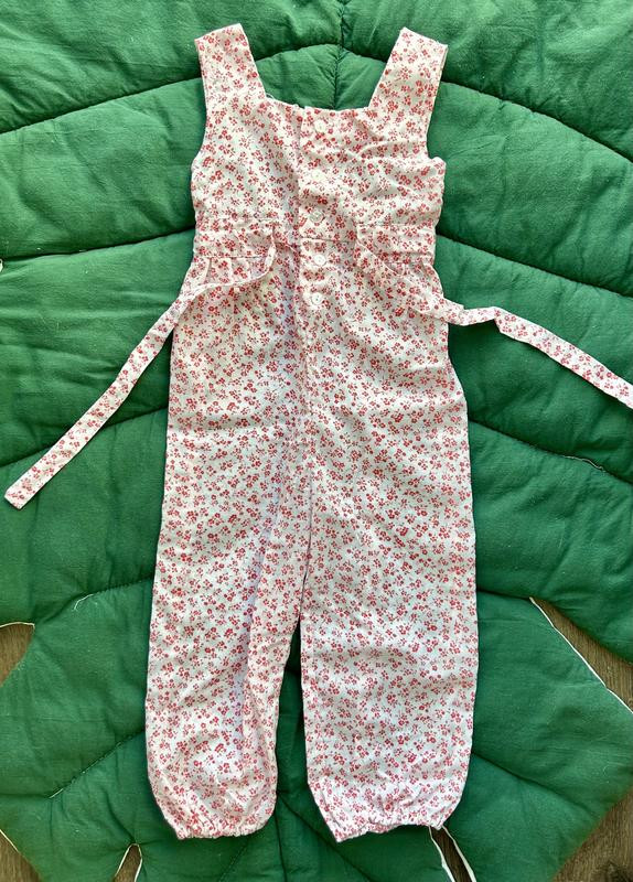 Красивый комбинезон из очень легкой дышащей ткани. Нежный цветочный принт. Низ шароварами, на талії поясок. Размер не указан, но ориентировано 80 (9-12 месяцев).