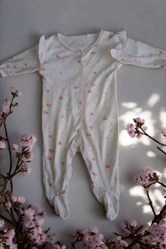 тоненький человечек, с принтом розом и рюшами, на возраст 3-6 месяцев, есть пятна на фото заметные
