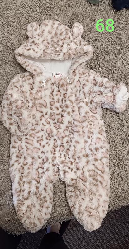 Очень теплый,удобный, пухнатый. Одягали 2-3 рази. Ручки закрываются.Размер 68