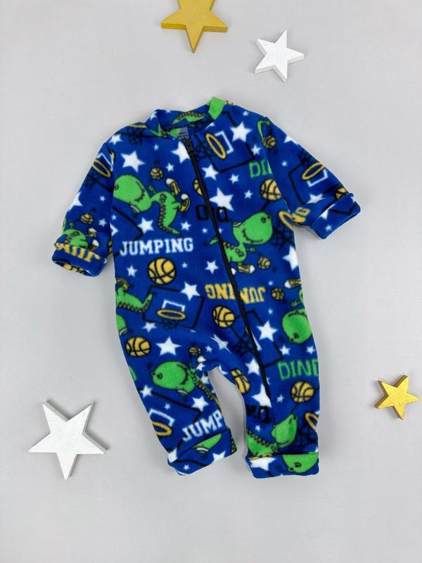 Теплый человечек на молнии для младенцев из ткани флис. В очень красивой расцветке для мальчиков - динозаврики. Имеет удобный воротничок и открытые ножки, что способствует более комфортному исследованию мира младенцем. Ткань отлично сохраняет тепло. Состав 100% полиэстер. Размеры: 68,74,80,86,92
