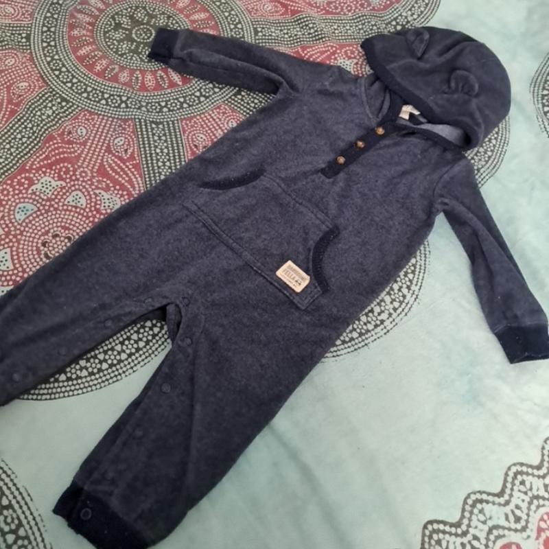Красивый темно синий ромпер для мальчика. Очень удобно для активных малышей. Внизу кнопки, удобно менять подгузник. Стан хорош, без недостатков.