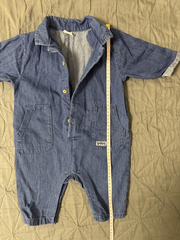 Джинсовий ромпер для малюка Розмір: приблизно 12–18 місяців (довжина див. фото з вимірюванням) Колір: класичний синій денім Матеріал: легкий джинс (бавовна) ✅ М’який і зручний, не сковує рухів ✅ Дві кишені спереду ✅ Ґудзики спереду для легкого одягання ✅ Кнопки внизу — зручно для зміни підгузка ✅ Нашивка «happy» додає милого акценту Стан: ідеальний, без плям чи пошкоджень.