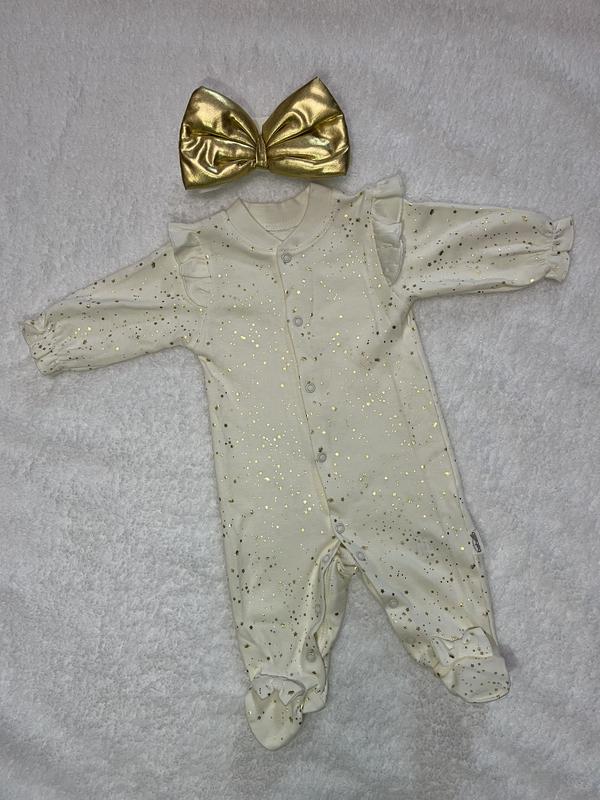М’який і ніжний чоловічок молочного кольору прикрашений дрібними золотими бризками (зірочками та коронами). Має милі рюші на плечиках і зручні кнопки по всій довжині. На ніжках є маленькі бантики та повʼязка на голову з великим золотим бантом. Чудово підходить для виписки, фотосесії або святкових подій. Комбінезон в ідеальному стані,одягали один раз на виписку. Країна виробник- Туреччина.