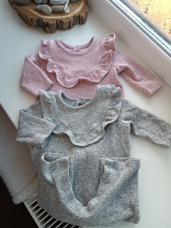 Теплые трикотажные комбезики без ножек на девочку 0-3 месяца Мягкие, теплые и очень комфортные для рисушка. Трикотаж нежный к телу, не колется, хорошо тянется и не сковывает движений. Без ножек - так что хватит на дольше, растут вместе с крошкой. Идеально для дома, сна и прогулок в коляске. Состояние отличное, без пятен и нюансов.