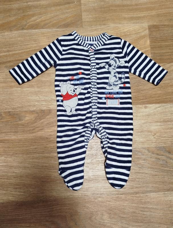 Невероятно милый комбинезон для новорожденного с героями Disney - Винни-Пухом и Тигром. Темно-синие и белые полоски, вышивка, звездочки, приятные надписи - идеальный вариант для подарка или ежедневного ношения. Подойдет малышам от 0 до 3 месяцев (до 5.5 кг, рост 56-62 см). Удобные кнопки по всей длине для легкого переодевания. Состояние: применяемый, но безупречный — без пятен, затяжек или потери цвета Материал: мягкий, комфортный, не парит Бренд: Disney baby at George